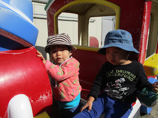 園庭で1歳児さんと一緒に遊んでいます。